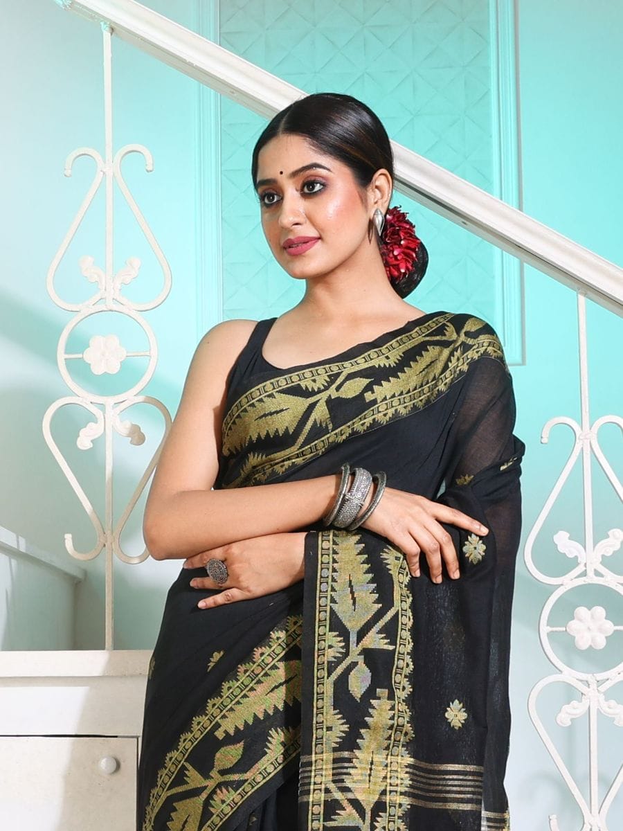 Admire the elegance of Jamdani sarees, known for their delicate patterns and sheer beauty. Each piece tells a story of artistry and dedication.
