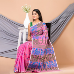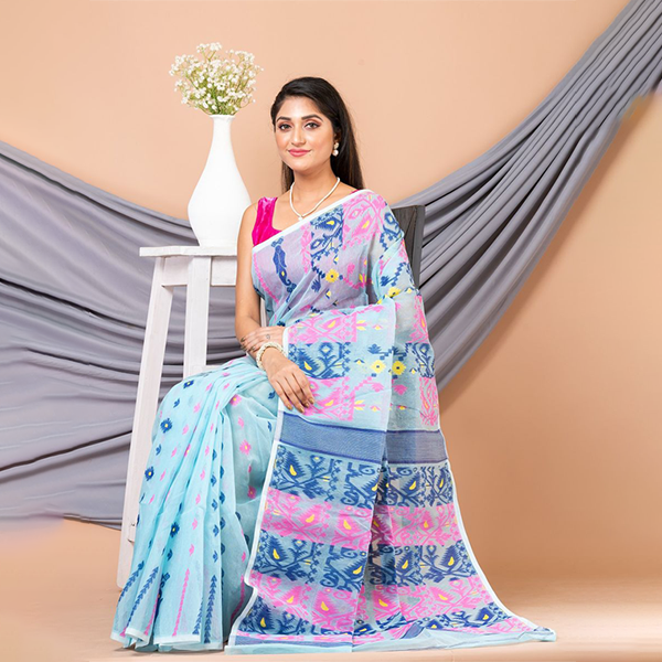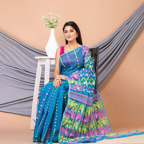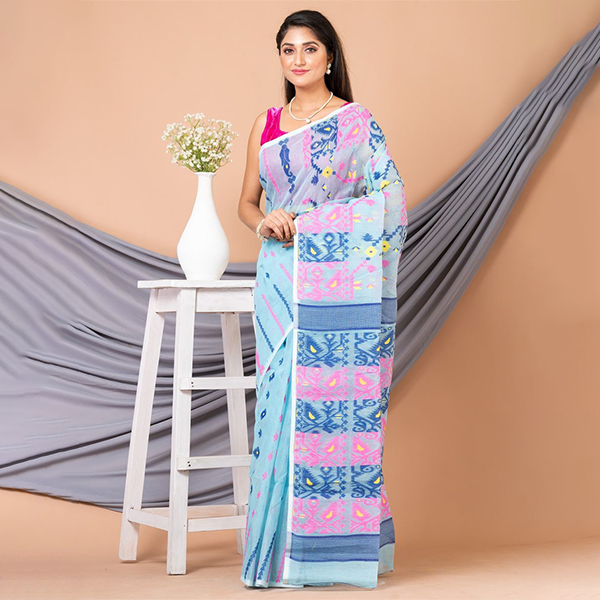 Featuring an all-body woven design crafted through fine machine work, this drape radiates elegance while offering ease of maintenance. The subtle sheen of cotton silk combined with intricate Jamdani patterns makes it a graceful pick for women who prefer ethnic charm with modern simplicity.